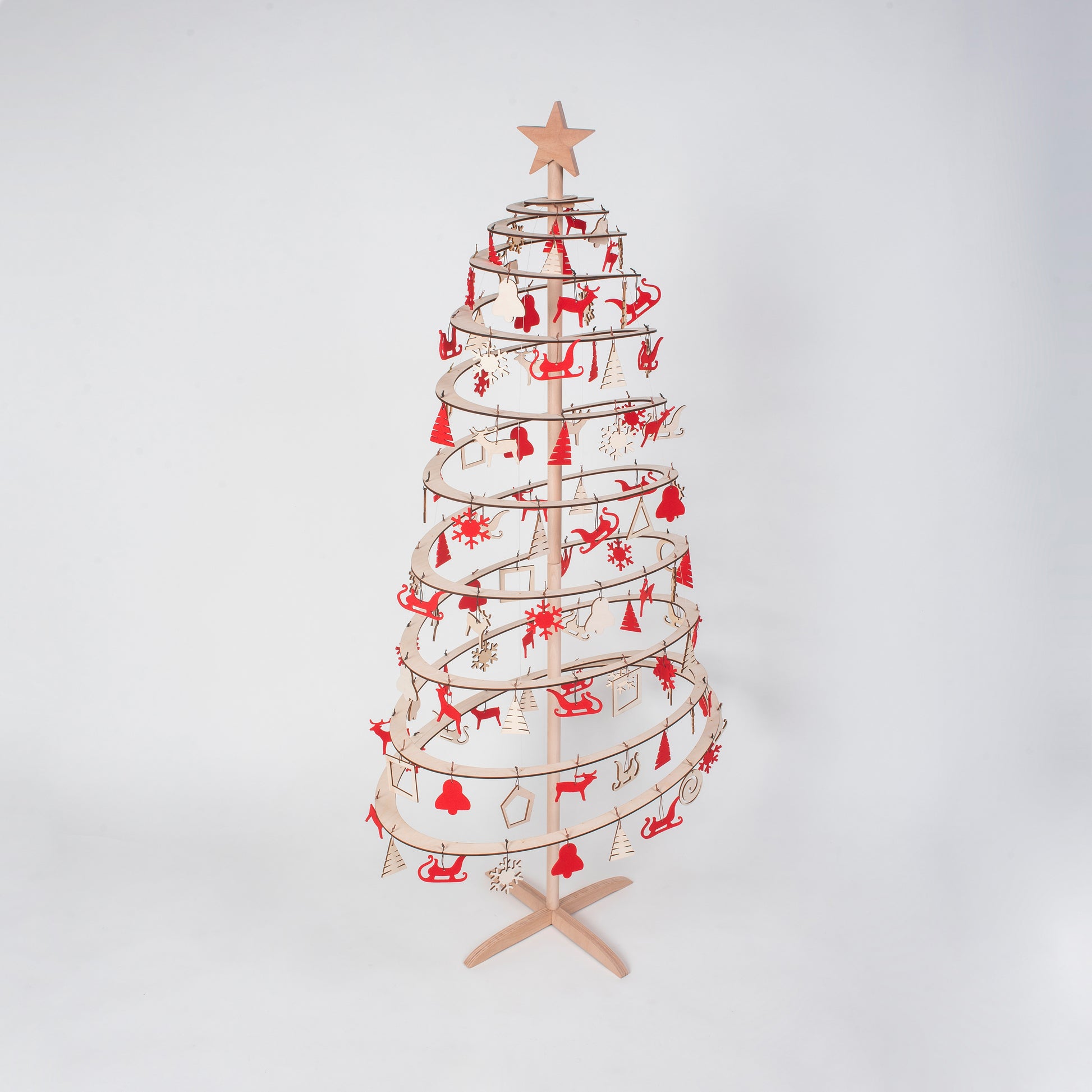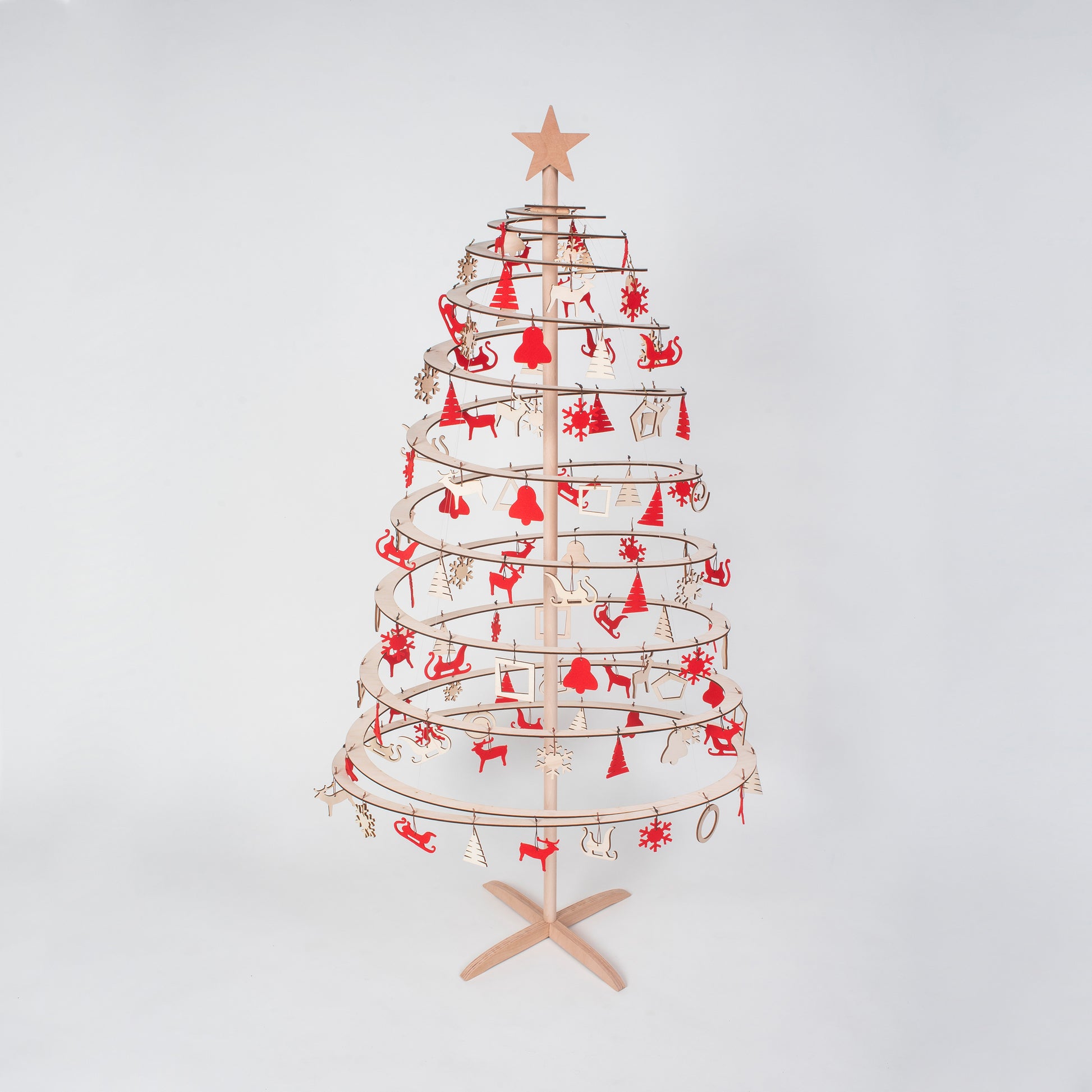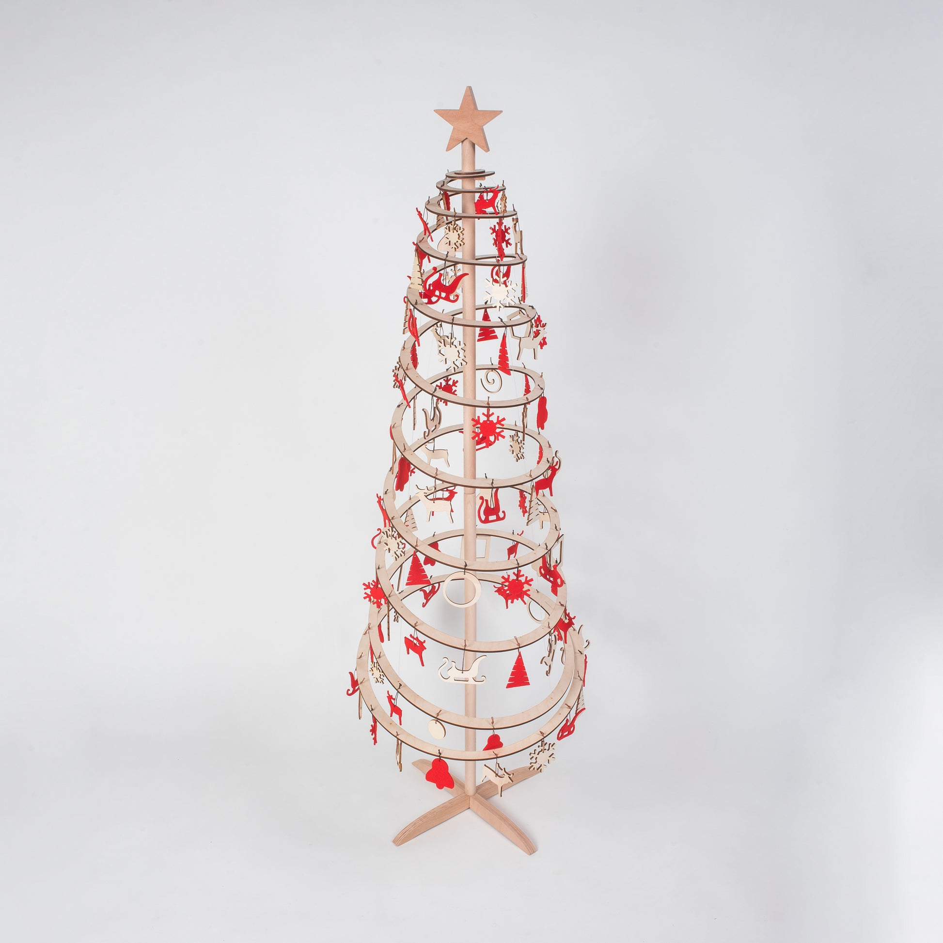 Das einzige Dekorationsset, das Sie brauchen. Die Mischung aus Filz- und Holzornamenten passt zum ovalen Weihnachtsbaum Spira Large.