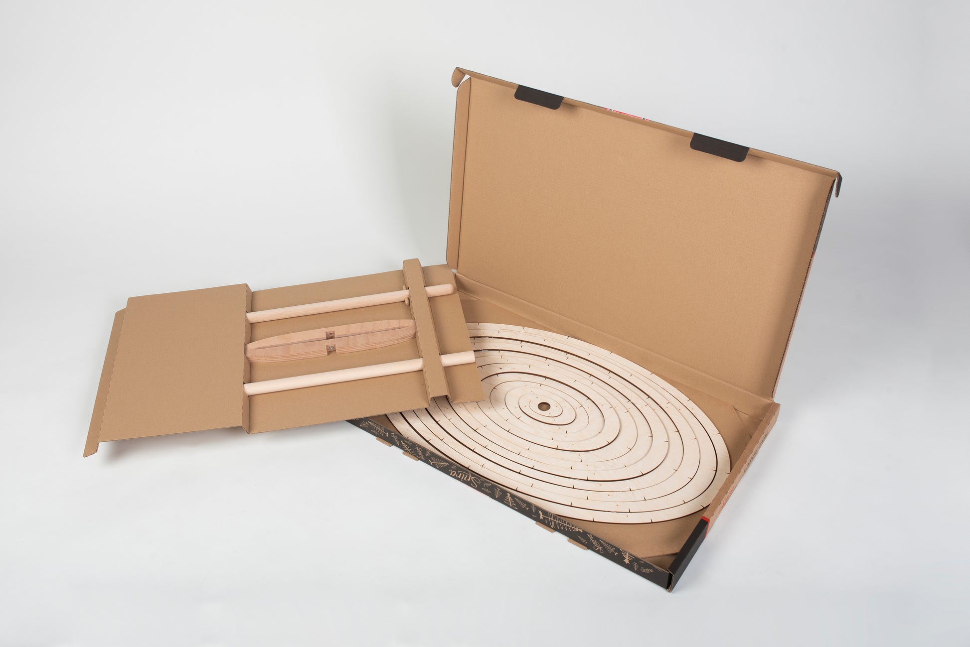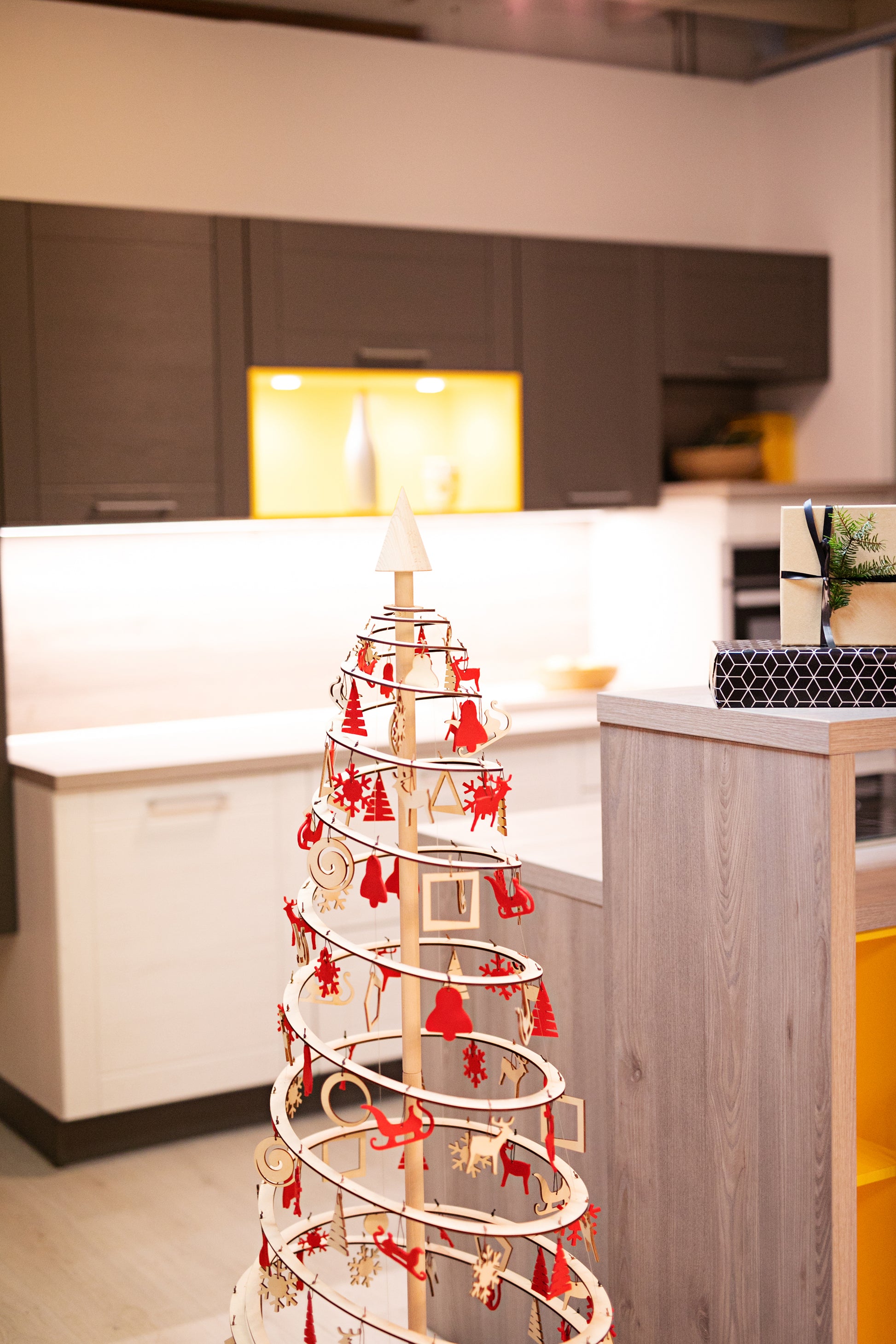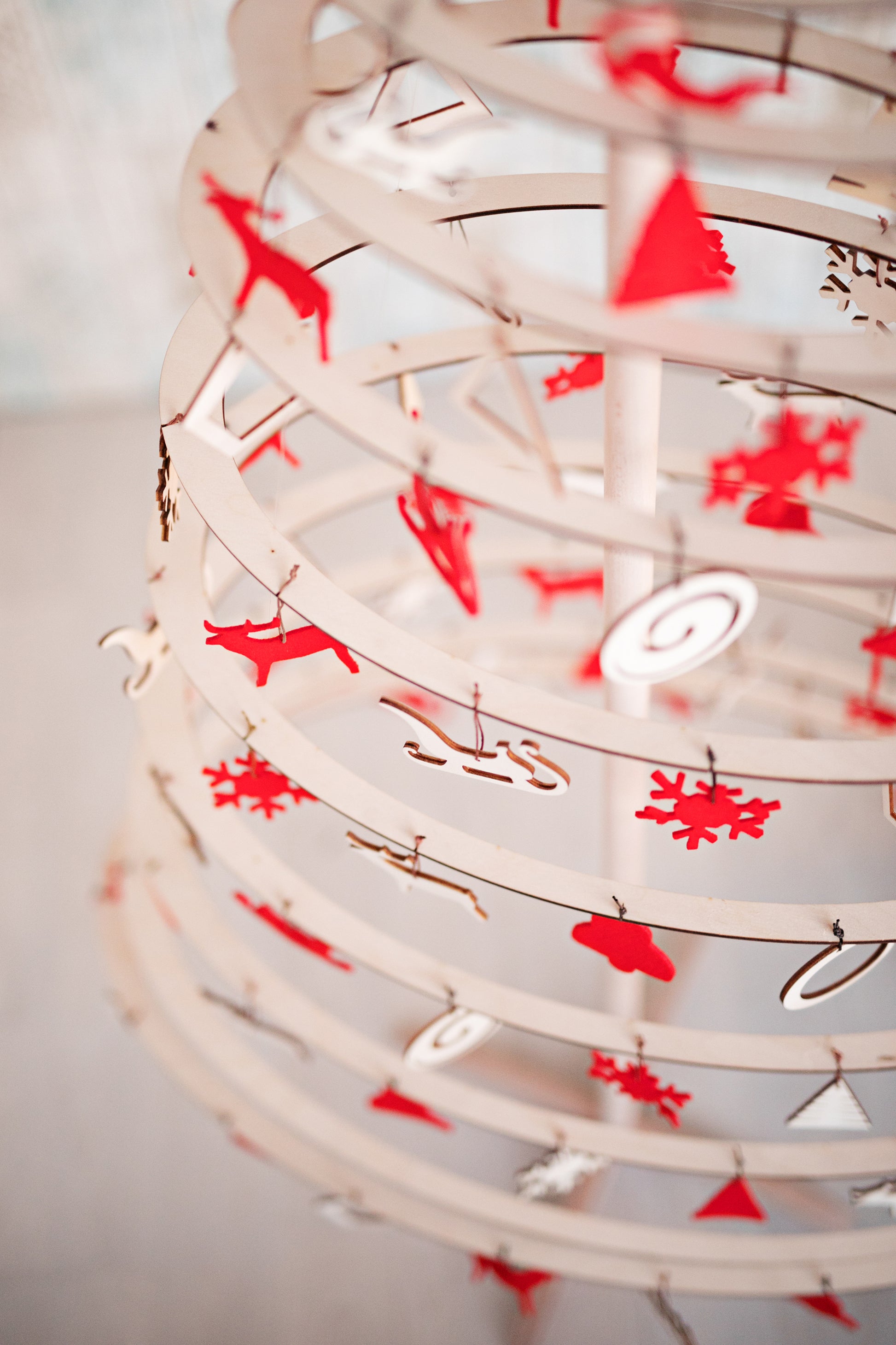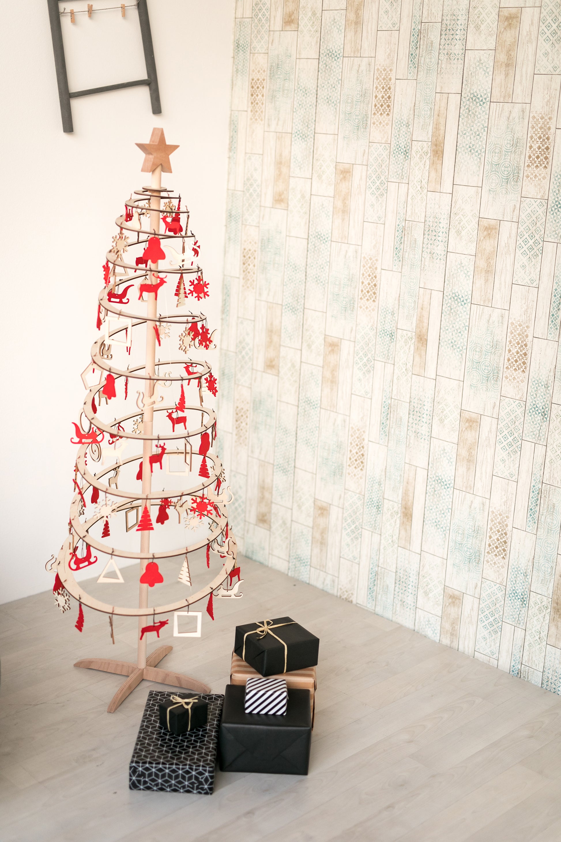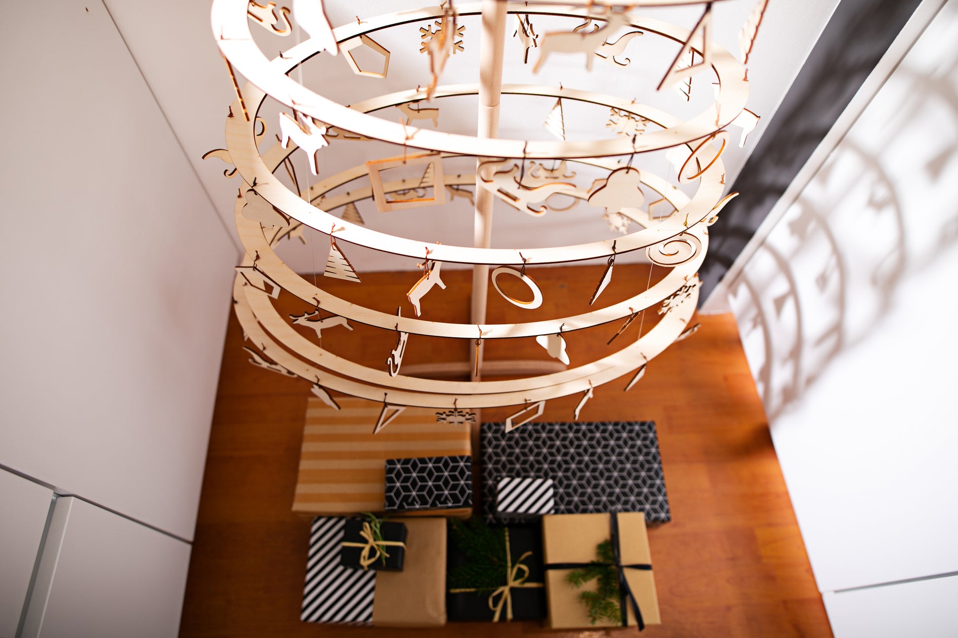 Der vor Ihnen liegende Weihnachtsbaum besteht aus lasergeschnittenem Sperrholz und einem Holzständer. Er lässt sich schnell auf- und abbauen. Zudem ermöglicht er eine einfache Lagerung in einer 5 cm hohen Kiste.